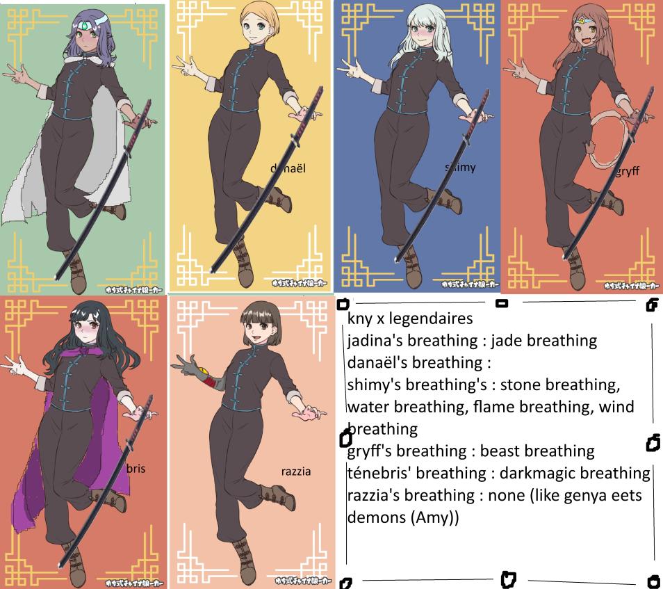 Image de profil @Isa Le mer 31/12/2025 - 13:31 Fanarts 4 0 4 kny(kimetsu no yaba(demon slayer)) x legendaires i made it with a picrew, and i drawed the capes, ear, tail, Amy, etc. by myself. you see the breathing techniques also... ~task : think a breathing technique for Danael~